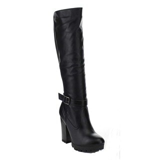 SaleBamboo GABY-09 Women's Buckle Strap Deco Lug Sole Chunky Heel Knee High Boots
