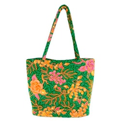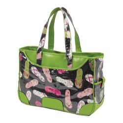 Stylish beach tote features shoulder straps and multiple pockets. Polycanvas interior lining. Designer Cotton outer with vinyl protective cover and faux leather accents. Designed in the USA. Lifetime warranty.