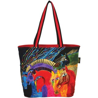 LAUREL BURCH-Medium Hobo Bag: Wild Horses Of Fire. The bright vivid colors and whimsical creatures that are the signature design of artist Laurel Burch adorn this canvas tote that is both a practical bag and a beautiful piece of art. This 9x14x4-1/2 inch Medium Hobo Bag features one main zippered compartment; a removable bottom support panel; one small zippered pocket inside; a pouch-style pocket on each outside end; one strap handle; and a wooden charm. Imported.Specs
