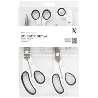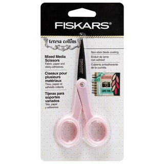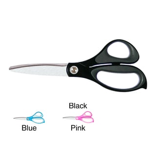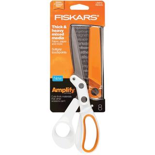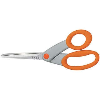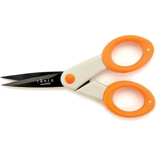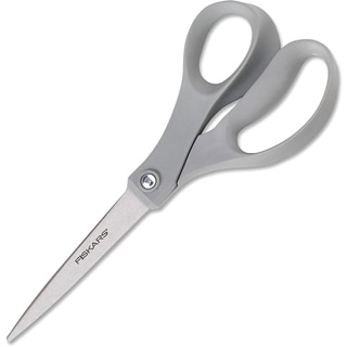 FISKARS: Non-Stick Titanium Scissors. The stainless-steel blades of these scissors feature a titanium coating which gives them a non- stick surface. They can be used to cut a variety of materials including paper; vellum; and cardboard; as well as tape and other adhesives without a build-up of residue. The titanium also provides long-lasting durability; while the comfortable SoftGrip handles reduce hand fatigue when cutting. The blades have a cutting surface of 3-1/2 inches and the overall length is 8 inches. Each package contains one pair of scissors. Imported.