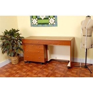SaleArrow 'Bertha' Oak Finish Airlift Crafts & Sewing Machine Table with Storage and Organization Cabinet