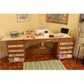 SaleArrow 'Sewnatra' Oak Finish Airlift Crafts & Sewing Machine Table with Storage and Organization Cabinet
