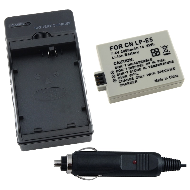This is a 3-piece accessory kit for Canon LP-E5. It keeps your camera charged and lens clean from dirt and smudges.| Caractéristiques | |