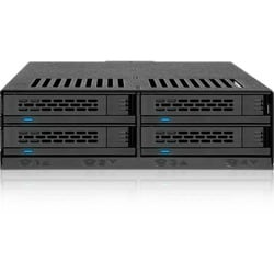 Introducing the Icy Dock MB994SP-4S Quad Bay 2.5" SATA/SAS Mobile Rack for use in a single 5.25" device bay. This product is constructed of heavy duty metal to hold up in the toughest of conditions. It includes ventilation slots on the front & back for maximum airflow to keep both SATA and SAS drives running cool, and an LED is placed on the front of each drive tray to give the user drive status at all times. Dual 4-pin power connectors are used to ensure a consistent power supply to all 4 drives, whether they are low power SSD's or power hungry 15000 RPM SAS drives. Also included are dual 40mm cooling fans to keep the drives running in at optimal temperatures in even the most intense applications.