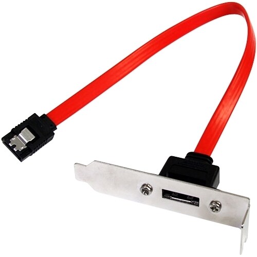 1ft Latching SATA to Low Profile eSATA Plate Adapter. This Latching SATA to eSATA Plate Adapter (low profile/half-height) adds external data support to any existing Serial ATA (SATA) controller, allowing you to connect external SATA (eSATA) storage to a computer. With support for data transfer rates of up to 6Gbps, this external SATA plate lets you take advantage of the increased data integrity provided by external hard drives or RAID devices that support eSATA connections.