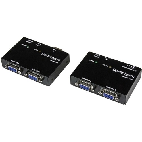 The local unit features a single VGA input as well as two VGA outputs giving you the ability to view and split your source VGA signal to two independent displays locally. The VGA video signal is then sent over standard 4 pair Category 5 or better UTP cable to the remote unit which also features two additional VGA outputs giving you the freedom to display your VGA source on up to four monitors in total.