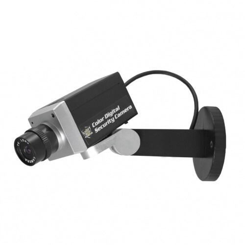 This dummy camera deters robbery and shoplifting without the high cost of a real surveillance camera. It features a built in motion detector. The camera will remain still until someone passes by. When it senses motion it will pan back and forth and a red light will flash. An alarm will also sound with several pre-recorded verbal warnings (verbal warnings are pre-recorded and cannot be changed). The verbal warnings include: "Intruder Alert", "Leave the room immediately", "Make no sudden movements", "Please touch nothing", "Vacate immediately".| Dimensions | 4 inches long x 3.375 inches wide x 8.625 inches high |