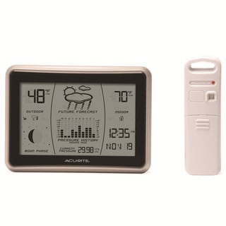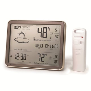 This Taylor Wireless Weather Station features an atomic clock and forecast function to monitor indoor and outdoor temperatures, humidity and barometric pressure. The unit also features 12-24 hour forecast, weather trend icons, comfort indiocastors and a blue backlight. It transmits up to 200 feet and requires four AAA batteries (not included).