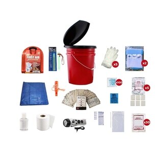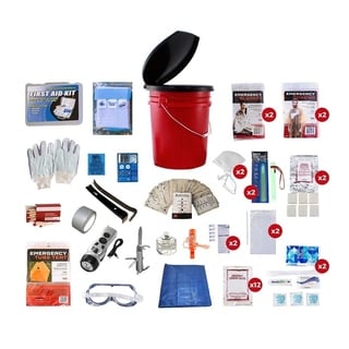 Deluxe Emergency Preparedness kit contains: One (1) portable lanter, one (1) portable radio, one (1) portable propane stove, one (1) 5" x 7" P.E. tarp, one (1) 10" x 12" P.E. tarp, two (2) emergency ponchos, two (2) emergency blankets, two (2) emergency sleeping bags, six (6) emergency water packs, two (2) emergency food bars, one (1) water purification kit, one (1) Pro II first aid kit, two (2) fluorescent orange safety vests, one (1) signal whistle, four (4) candles, one (1) angle head flashlight, one (1) camp soap, one (1) waterproof matches, one (1) fire stick starters, five (5) emergency light sticks, one (1) 5-gallon collapsible water jug, one (1) 50-foot rope, one (1) cargo bag 30" x 14", one (1) 11-function knife, one (1) folding hand saw, one (1) 6-in-1 survival multi-purpose tool, four (4) toilet bags.Specs