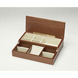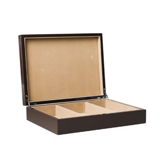 A beautiful natural grain wood is finished in a gorgeous dark ebony veneer and a high gloss piano finish. The goldtone quadrant hinges and closure adds a lovely accent to this beautiful, velvet-lined jewelry box.| Dimensions | See description |