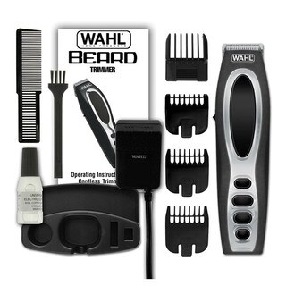 Create the style you want and maintain your beard with ease with this Wahl beard trimmer. This unit comes with everything needed to keep your facial hair at the desired length. A six-position guide can be added to the self-sharpening blades. Use the included stubble guard, or set the length of your beard to 1/8-inch or 3/16-inch. This rechargeable unit comes with its own case, a stand, blade oil, a beard comb and a charger, making it perfect for travel.- Wahl rechargeable beard trimmer can be corded or cordless
