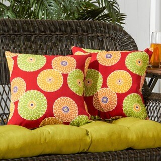 Add a bright pop of color to your patio furniture with these outdoor accent pillows. Elegant, circular designs in shades of blue and green on a white background bring a touch of style to outdoor loveseats and chairs. Each accent pillow in this set of two features recycled plastic bottle polyfill for environmental friendliness.The bold colors and unique print of these pillows are sure to spruce up the look of any outdoor furniture set you own. Rest your head on a pillow the next time you want to take a nap or catch some rays out by the pool. The fabric is easily spot cleaned if anything spills on the pillows. Be a friend to the environment each time you snooze on one of these ecofriendly pillows. Each plush pillow is stuffed with recycled water bottles, then adorned with an eye-catching pattern that features vibrant shades of blue and green. Liven up your outdoor decor by placing these contemporary 17-inch pillows on your porch swing or patio chairs.