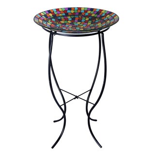 This 18-inch Red and Gold Mosaic Glass Birdbath has a solid metal stand. Made of glass and metal. Boasts hues of red and yellow.| Caractéristiques | |