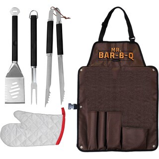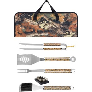 - Quantity: One (1) 4-in-1 spatula, one (1) pair of tongs, one (1) fork, one (1) knife, one (1) basting brush, one (1) grill brush, eight (8) corn holders, four (4) steak knives, one (1) plastic case