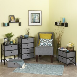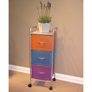 Add that needed storage to any room in the home with this 3 drawer large storage tower. The white color foldable polypropylene drawers snap together with silver buttons and come with a decorative silver lip around the top of the drawer. The silver curved handles make it easy to pull the drawer in and out the unit, even completely removing them to take your things to another room. The frame is made out of metal and is then powder coated to give it a durable surface. The three (3) drawers rest on a metal rail on the frame and come with a stop on the back . The perforated metal top offers a sense of style to the top of the unit as well as an additional storage space. The rounded top snaps onto the rails on assembly. The 2-inch casters make this unit easy to move around the home.- Type: Drawers