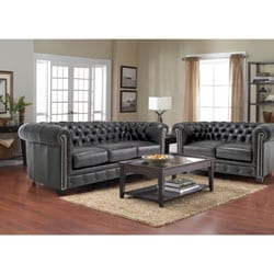 SaleHancock Tufted Black Italian Chesterfield Leather Sofa and Loveseat