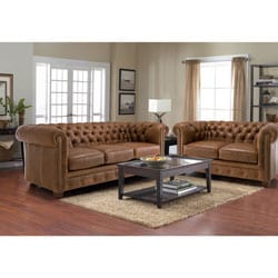 SaleHancock Tufted Distressed Saddle Brown Italian Chesterfield Leather Sofa and Loveseat