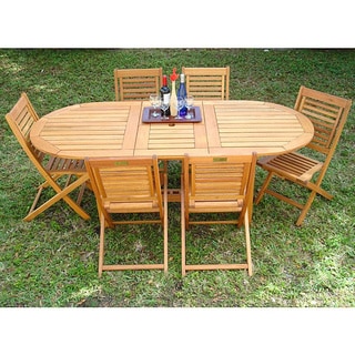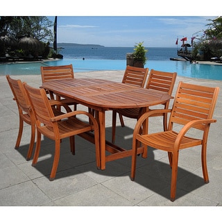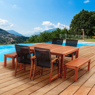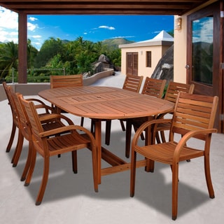 Enjoy dinner outdoors with this oval dining set from Amazonia. This Cosmopolitan nine-piece dining set offers class and comfort with its sling chairs with armrests made of sturdy eucalyptus wood. Its wood construction provides weather-resistant qualities making it ideal for any outdoor setting. When decorated with delightful delicacies, this dining set is fit to showcase any outdoor meal.- Set includes: One (1) oval extendable table, eight (8) armchairs