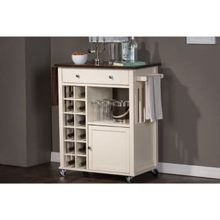 SaleBaxton Studio Justin Modern Contemporary Cream White Solid Wood Kitchen Cart with Dark Oak Drop Leaf Top and Built-in Wine Rack