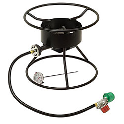 Cook an impressive meal in this high pressure propane burner. Wide-spaced legs support oversize cooking pots and make this burner a great choice when cooking for a crowd. The cast iron burner ensures quick and even heat, and the high pressure regulator provides complete control while cooking.Featuring a durable, wielded steel frame this burner lasts through all seasons. A long braided hose conveniently allows the flexibility of placing the burner away from the propane tank, and the 360 degree windscreen assures a steady flame throughout your meal preparation. This burner also offers a compact design to allow easy transportation.