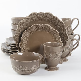 Displaying a subtle sophistication that coordinates beautifully with table and kitchen decor, this BonJour Orchard Harvest 16-piece Dinnerware Set is ideal for casual meals as well as formal entertaining. Durable stoneware forms an elegant ivory-colored backdrop for delicate leaves and tendrils, and an ochre border on the rim of each piece adds an elegant touch. Each of the salad plates in the dinnerware set is adorned with a unique, full-color fruit motifs of golden pear, juicy grapes, luscious peach and ripe plum.