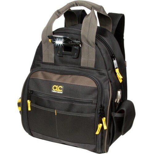 Our Tech Gear ��� dual compartment 53 pocket LED lighted tool storage backpack features an integrated 3 level LED light that swivels, two straps for cordless drill/driver and battery charger, carrying handles, adjustable padded shoulders with sternum strap and back padding.
