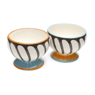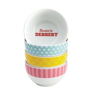 They'll all holler for extra scoops when ice cream is served in this fun Cake Boss Serveware 4-Piece Porcelain Ice Cream Bowl Set in the "Icing & Quotes" Pattern. This retro-inspired bowl set complements the other lively serving pieces in the Cake Boss Serveware collection that makes serving and eating sweet treats even more enjoyable. With their hip, retro-style design and bakeshop heritage look, the four 4-3/4-inch, sturdy porcelain bowls have the ideal capacity for the perfect portion of ice cream - with room for toppings, of course! Each one features an icing design encircling the outside in yellow, pink, red and light blue and a different message inside on the bottom - "Enjoy," "Cake," "Delizioso," and "Sweet." These colorful bowls make serving ice cream, sorbet, gelato, frozen yogurt and more fun for everyone. The set is microwave and dishwasher safe, and coordinates with Cake Boss plates and mugs in a variety of designs. Best of all, this vibrant ice cream bowl set from Cake Boss Serveware complements the other great items in all the Cake Boss collections. Dish it out - ice cream and other sweet treats, that is - in the colorful Cake Boss Serveware 4-Piece Porcelain Ice Cream Bowl Set in the "Icing & Quotes" Pattern.| Caractéristiques | |
