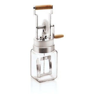 Tap your inner pioneer and make delicious homemade butter in minutes with this innovative mini churn. Simply fill jar with heavy whipping cream that has been stored at room temperature for six to eight hours, shake for three minutes or until buttermilk separates from butter. Strain off the buttermilk with the built-in sieve, rinse the butter two to three times with cold water, twist off the ramekin, salt to taste and enjoy!- Materials: Plastic