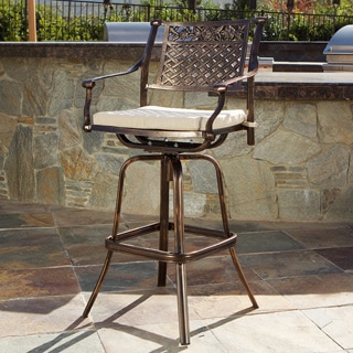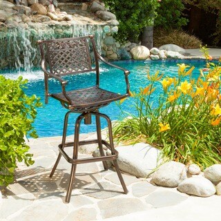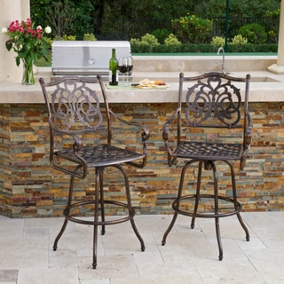 Spruce up your outdoor living space with these elegant Christopher Knight Home cast aluminum bar stools. Made out of cast aluminum, the swivel bar stools add sophistication and class to any deck or patio. The swivel design allows you to face any guest as you chat for a more comfortable conversation.With their striking classical appearance, these bar stools will add a look of sophistication to any outdoor bar. The seat has a weave-like design, while the back features floral friezes at the top. As durable as they are attractive, you can rely on these bar stools for many years to come. These bar stools are versatile and comfortable for more enjoyable entertaining. The sturdy square footrest provides comfort for tired legs, and the stool easily swivels for face-to-face conversation, so guests can stay longer and socialize more easily. If party guests become overnight guests, add a cushion to instantly transform these striking copper outdoor bar stools into beautiful additions to a rustic indoor breakfast counter.