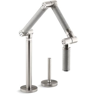 Two-piece articulated spout folds out of the way when not in