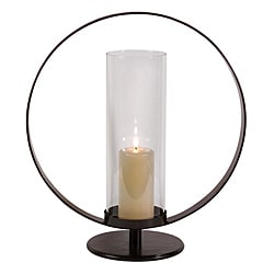 Danya B Large Orbits Metal and Glass Hurricane Candleholder will transform your living space with its refined, rustic look and provide the right ambiance for any occasion. A great choice for bathrooms, bedrooms, porches or decks, this large glass hurricane sits on a beautiful iron orbits design holder and supports one pillar candle. (candle not included). Danya B is a registered trademark of Danya B Inc.- Colors/finish: Black