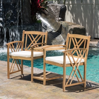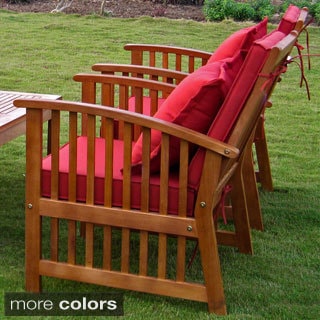 Bring a welcoming touch to any patio or deck with these beautiful wood patio chairs. Constructed from solid acacia hardwood, each chair is naturally sturdy yet stylish. Feature them as a stand-alone piece or with our exclusive dining or conversation sets. Included are two deep-seated chairs with plush, soft seat cushions.- Set includes: Two (2) chairs and cushions