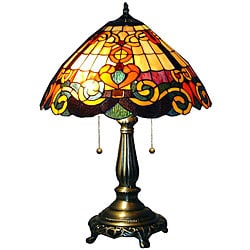 Perfect for nearly any decor, this well-made table lamp has been created with the same meticulous techniques that were developed in the early 1900s by Louis Comfort Tiffany. This attractive lamp features hand-cut pieces of stained glass, each of which are carefully wrapped in copper foil.Bringing together rich amber, gold and red tones, the loop-pattern shade features scalloped edges and high arches framing symmetrical knot work for an abstract take on the solar theme. The bronze-finished lamp features textured scrollwork gathered through an accenting amber-look bead at the base before flaring at the bottom for a regal touch. Featuring two light bulbs with individual pull switches, this lamp gives timeless style to any sitting area, library or formal space.