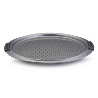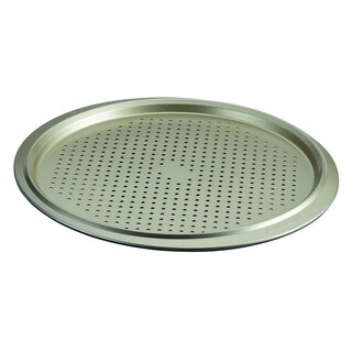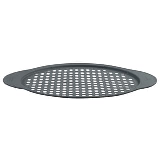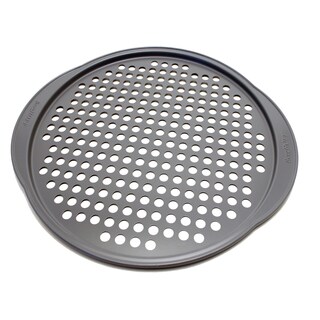 In the interest of a crisp pizza, the perforated bottom of this Faberware pan is designed to deliver as much heat as possible to the bottom crust. In addition to letting heat in to sear the bottom of the crust, the holes also allow steam to escape.- Surface: Non-stick