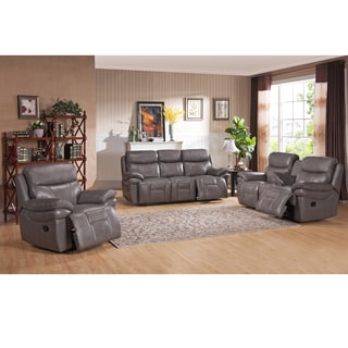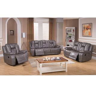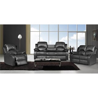 Complete your living room with this three-piece bonded leather sofa set from Furniture of America. Made of solid hardwood, metal, steel and bonded leather, this set is built to last and soft to the touch. Each piece offers a luxurious reclining option and elongated pillow-top armrests, making this set the pinnacle of relaxation.- Set Includes: (1) Recliner Sofa, (1) Recliner Loveseat, (1) Glider Recliner Chair