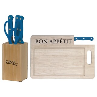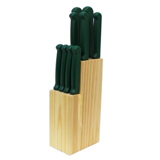 This Ginsu Essential Series 14 piece cutlery set includes: 8-inch chef knife, 8-inch slicer, 7-inch santoku, 5-inch boning knife, 4.5-inch utility knife, (6) 4.5-inch steak knives, 3.5-inch paring knife, kitchen shears and storage block. A classic, natural wood block houses a variety of knives for paring, slicing, trimming and chopping. Each knife features a simple and ergonomic resin handle secured with three rivets for control and comfort with every slice.| Caractéristiques | |
