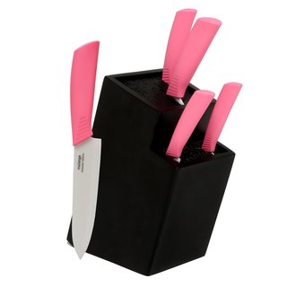 SaleMelange 6-piece Pink Ceramic Knife Set with 2-tier Black Wood Universal Knife Block