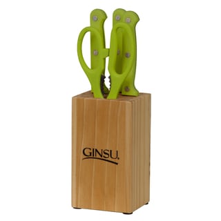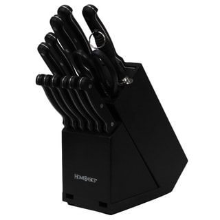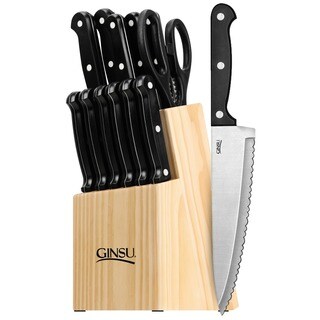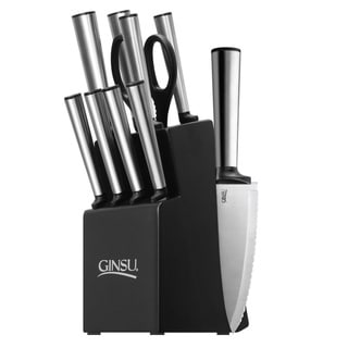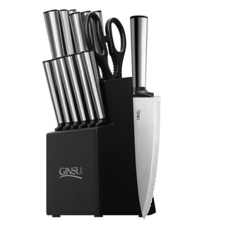 Ginsu's Essentials Series 14-piece Black/Black cutlery set features colorful, traditional Japanese style handles that are balanced and comfortable to hold. Ginsu blades are constructed from stainless steel and feature a two-dimensional serrated edge that is symmetrically cut on either side for more accurate slicing and for either right- or left-handed use.A must-have for any kitchen, these stainless-steel knives can take on any task. Visually pleasing polyresin handles keep the knives from slipping, reducing the chance of accidents during food prep. A variety of lengths ensure you have the tool you need for every job, and a stylish included storage block keeps these knives perfectly organized and close at hand.