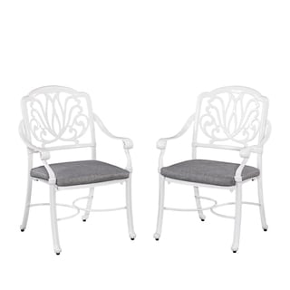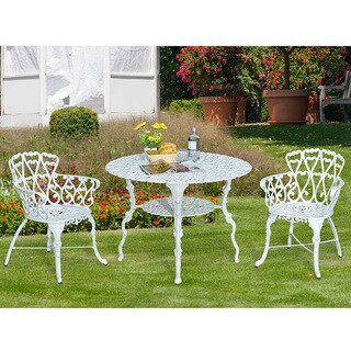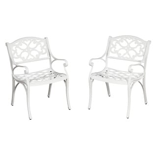 Enhance your outdoor living space with this delightful white outdoor dining set. Adorned with a combination of basket-weave patterns and stylish scrolls on the backs of the chairs, this set adds an inviting style to your patio or backyard. With a convenient opening in the table, you can set an umbrella in place to shade your space as needed. Relax and enjoy this durable cast aluminum outdoor dining set in style.- Set includes: 42-inch round dining table, and four (4) arm chairs