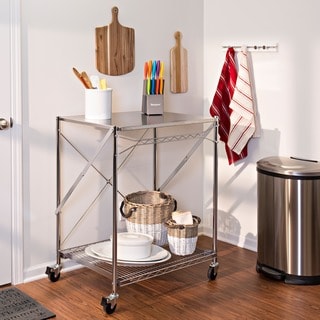 Easily maneuverable on rolling casters that lock into place for stability, this utility table folds for easy storage. Perforated top and bottom surfaces double the work surface, while a basket style shelf manages smaller items.- Color: Chrome