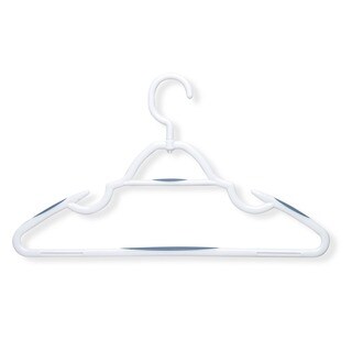 Honey-Can-Do HNGT01322 12-Pack Soft Touch Skirt / Pant Hangers with Clips, White/Blue. Truly a full-featured hanger, this versatile, plastic clothes hanger is perfect for all your skirts and pants in a convenient pack. Inset soft rubber grips provide a non-slip surface that holds all types of fabric beautifully in place. An integrated accessory hook secures coordinating scarves, belts, or ties neatly in place - simplifying your closet and your morning. Adjustable soft touch pant / skirt clips are perfect for small or larger sizes. A big help in the laundry room, these hangers are also great for air-drying delicates.| Dimensions | 6.5 in L x 11.5 in W x in H /16.5 cm L x 29.2 cm W x cm H |