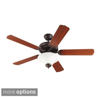 This Sutter Place Select collection 42-inch 5-blade ceiling fan features a oil brushed bronze finish, walnut/cherry reversible blades with a 12-degree pitch and removeable light with umber alabaster glass. This fan will complement many traditional decors. Pull chain features 3 forward speeds and manual reverse .