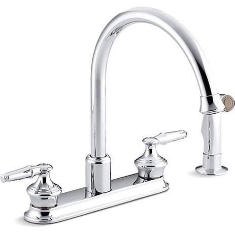 The Kohler K-15889-K-CP Polished Chrome Coralais Decorator Kitchen Sink Faucet With 9 inch Traditional Spout And Sidespray, Requires Handles is designed to fashionably match your decor. The K-15889-K-CP features solid brass construction for durability and reliability.- Faucet Type: Coralais Decorator kitchen sink faucet with 9 inch traditional spout and sidespray, requires handles
