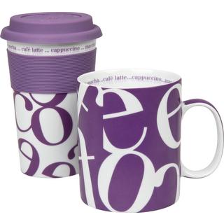 fun set Bought this as a anniversary gift. Nice porcelain mugs. Cute Fun good price. Note that the travel mug is also porcelain.