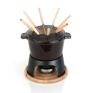 - Set includes: One (1) heavy duty enameled cast iron fondue pot, one (1) cast iron fork guide, six (6) color coded fondue forks, a sturdy two (2) piece cast iron base and a safety gelled fuel burner