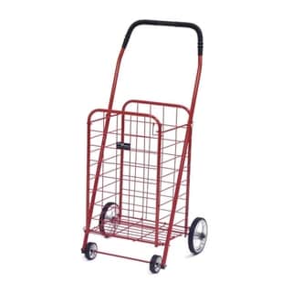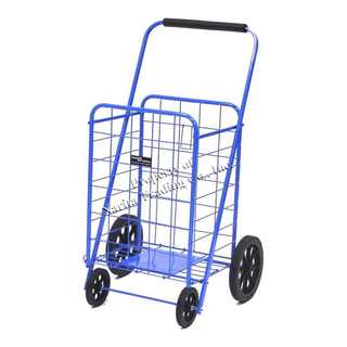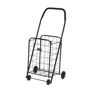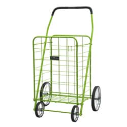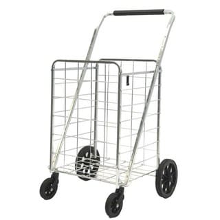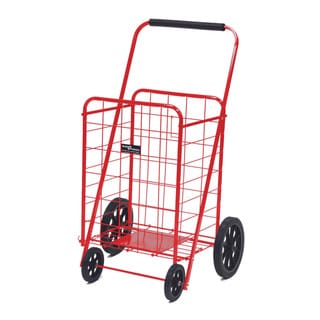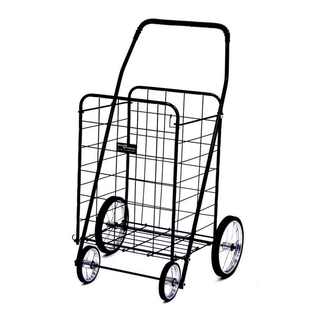 "This exceptionally high quality four wheel foldable Jumbo Load Runner is perfect for carting groceries, laundry and other utility needs. It has a weight capacity of 100 pounds and dual plates at the bottom of the basket that reinforce the carrying strength. Hardened plastic wheels with genuine rubber treads and a vinyl handle make this cart easy to control and maneuver.