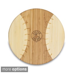 Score a home run at your next party with this round baseball-themed cutting board. Crafted of eco-friendly bamboo, it can be used as a cutting board or a serving tray.- Approximately 104 inches of cutting surface