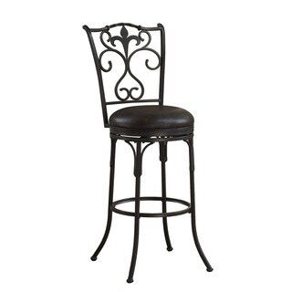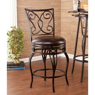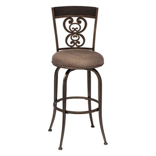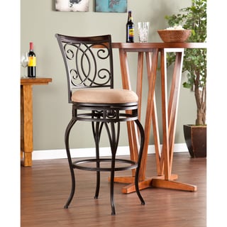 Intricate scroll metalwork highlights the back of this 'Magnolia' swivel bar stool. This elegant 30-inch bar stool is finished with a luxurious suede upholstered seat and deep rusted gold finish.- Materials: Metal, polyester