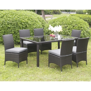 Dine outside on a warm summer eve with your family. With seating for up to 6, the PE rattan dining set includes two arm chairs, four armless chairs and one table. The chairs are comfortable and sturdy. The table is built with a glass surface that reflects back the beautiful sunlight and nature all around you. You will want to eat outside more often. The dining set is perfect for family get-together and dinner parties, and has ample room for food and drink. Enjoy the PE rattan material which is so easy and convenient to clean. Create a fun dinner atmosphere outside in your own backyard.- Color breakdown: Rattan: 70-percent Brown, 30-percent Grey. Cushion: City Beige