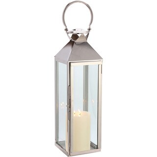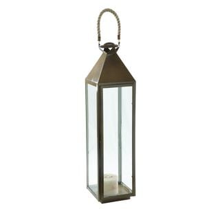 This large nautical inspired lantern stands as a beacon for your garden or patio. When illuminated by candlelight, these lanterns cast a warm glow around your space. Beautifully adorned with a sturdy rope handle and structured nickel finish, this is the perfect way to welcome your guests in with this lighthouse fixture. Product dimensions are 12"x12"x2".- Type: Lantern